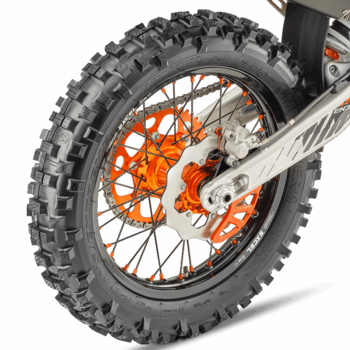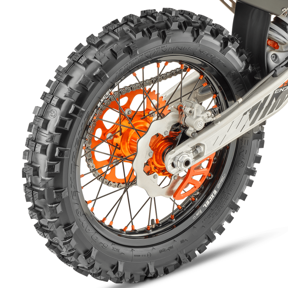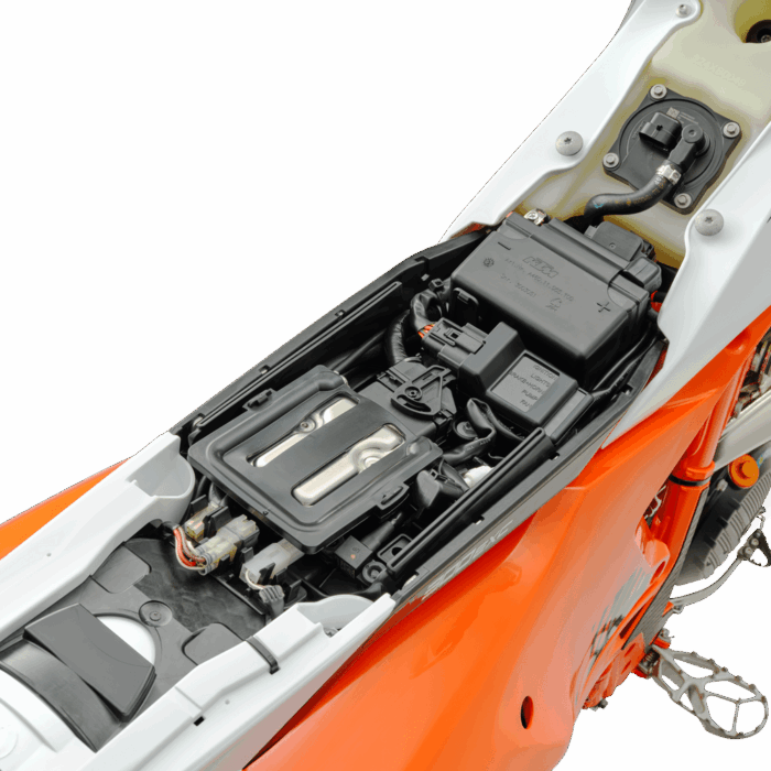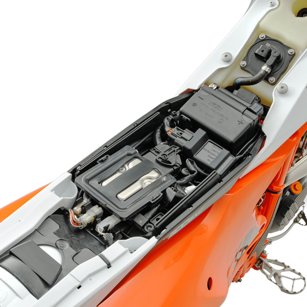 Entre su equipamiento especial destacan el chasis naranja, el juego de llantas Factory, protectores de chasis de fábrica y un asiento Factory acanalado que mejora el agarre del piloto. También incorpora interruptor de cambio de mapa, puños ODI Lock-On extra blandos, cubremanos cerrados y ventilador de radiador para garantizar el máximo control en condiciones extremas. A nivel técnico, cuenta con pletinas de dirección mecanizadas y anodizadas en negro, reguladores de precarga para las horquillas WP XACT, protección de motor y sistema de frenos reforzado con disco delantero flotante, disco trasero sólido y protectores específicos.
